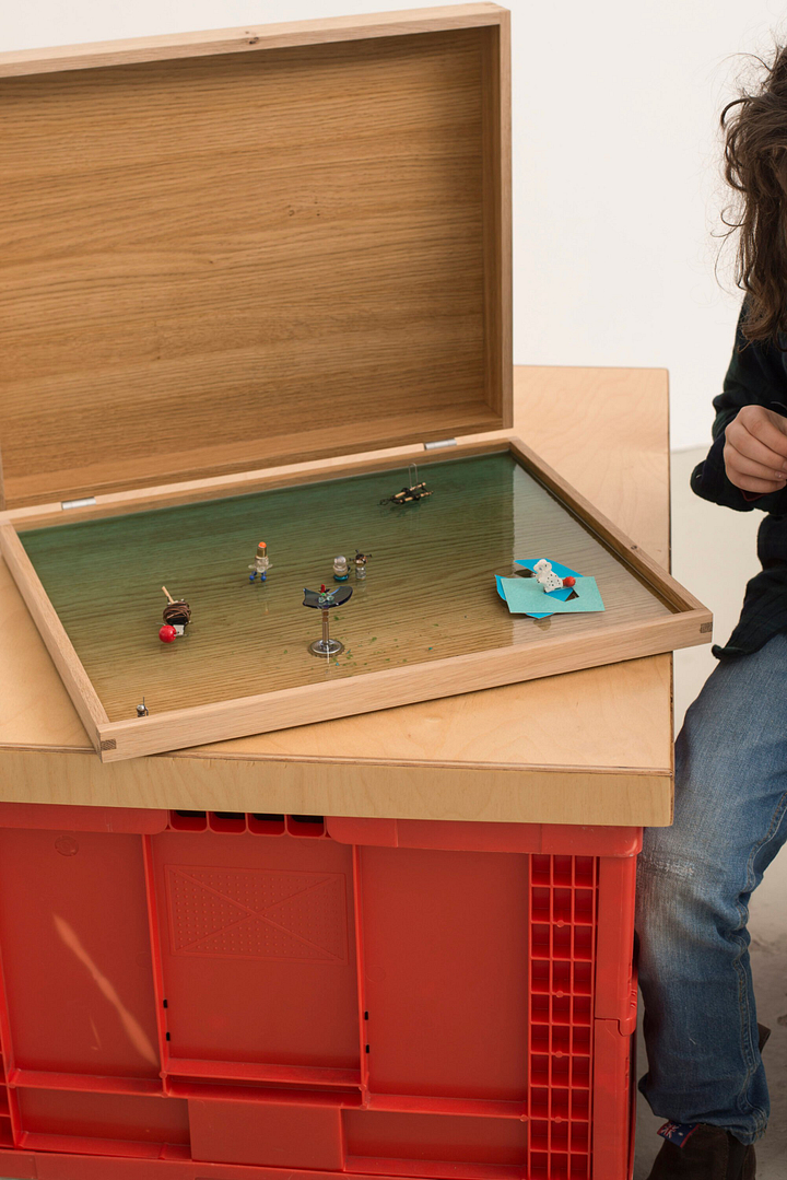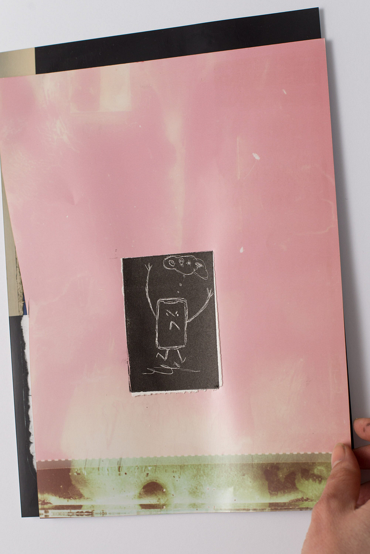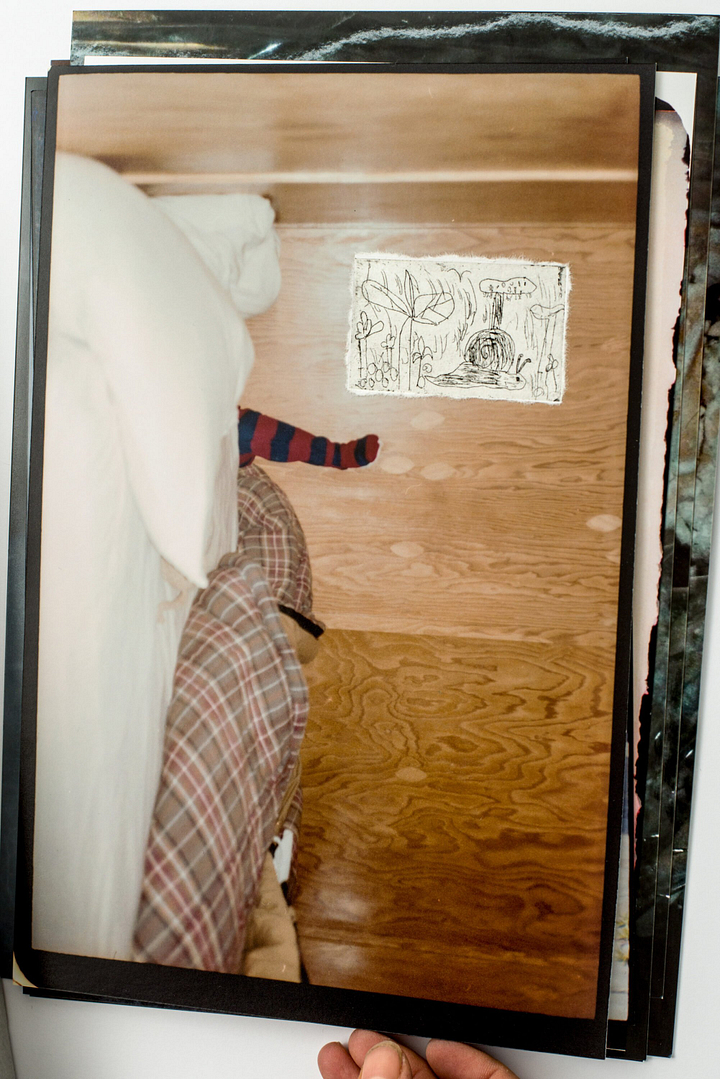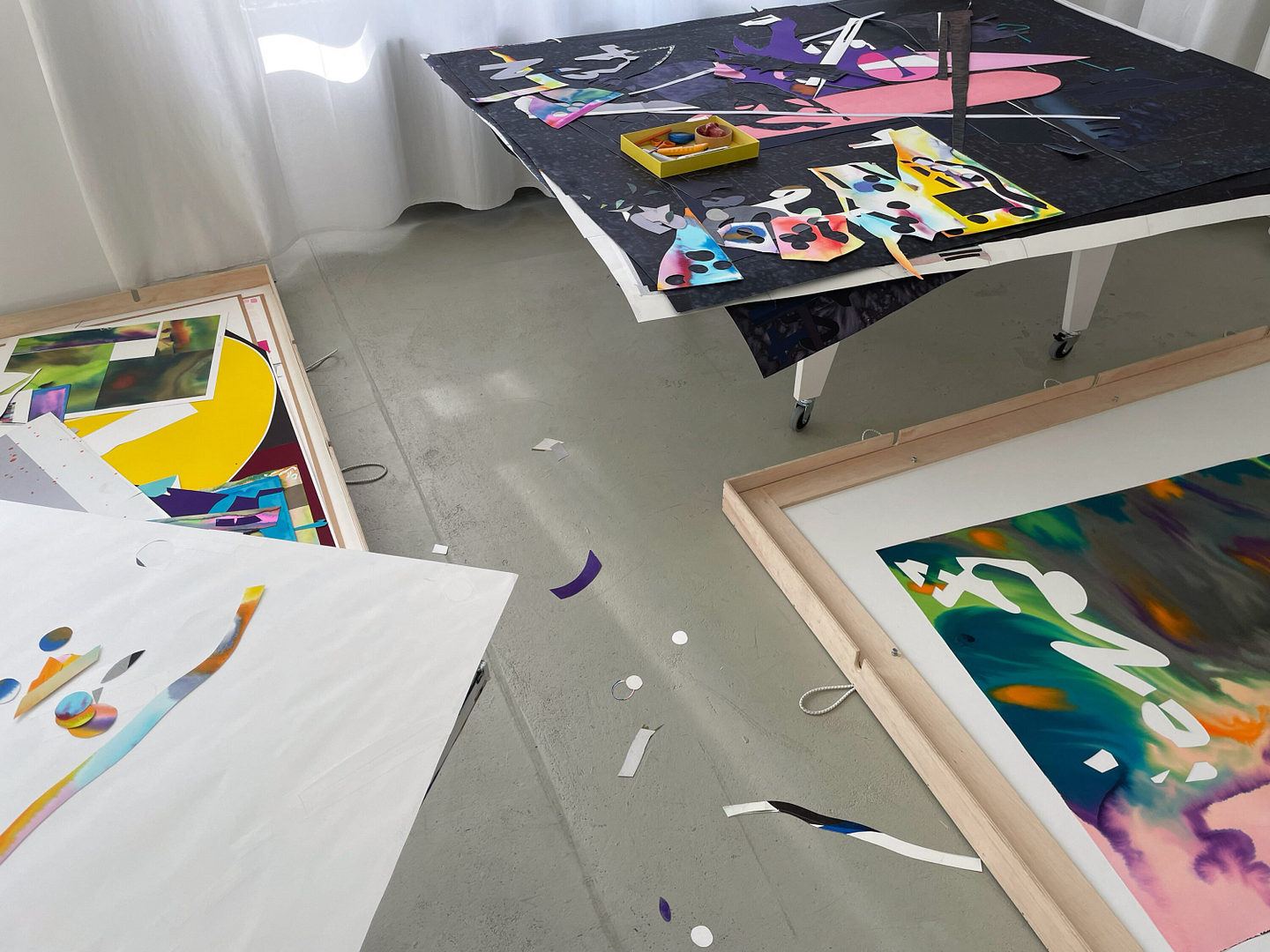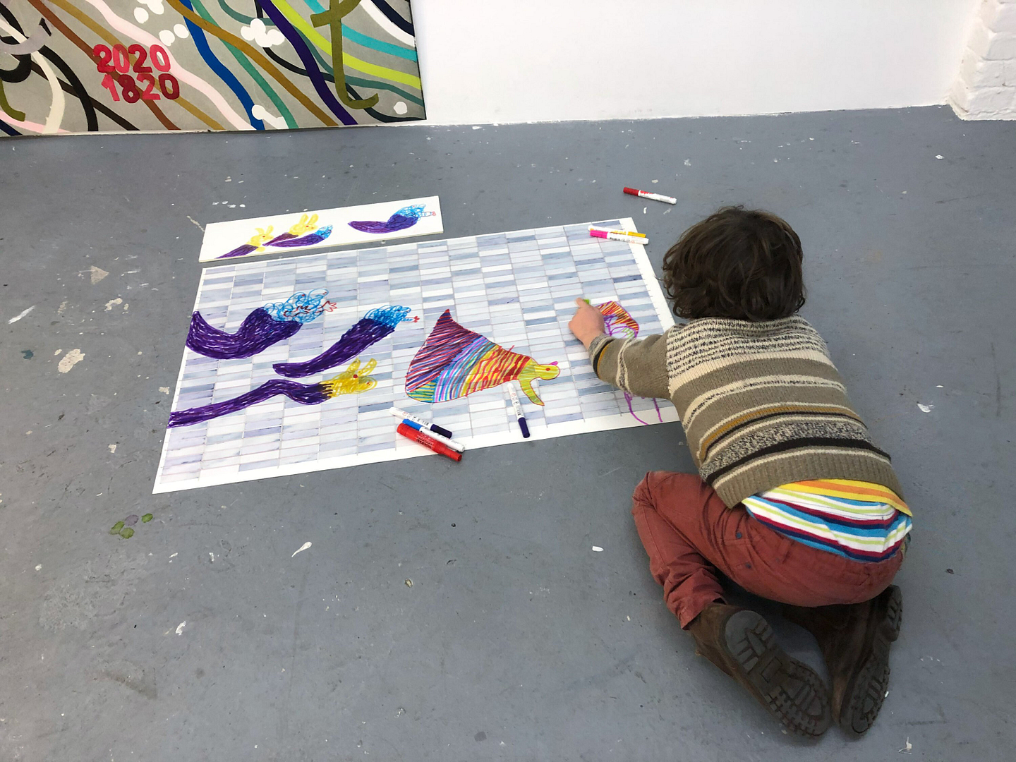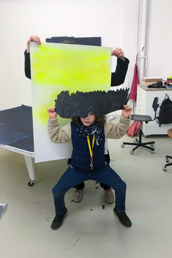 The kid hung around in the shared studio and his presence brought play and self-forgetfulness into the space. His singular responsiveness unsettled each artist’s established habits: a simple colour test could precipitate a new field of experimentation.